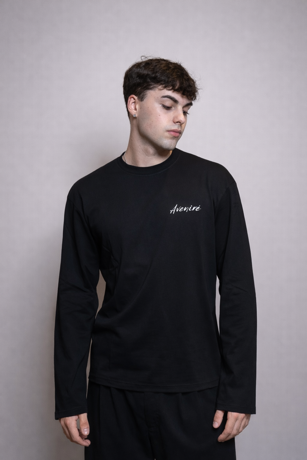 Long sleeve nera con stampa serigrafica Aveniré Studio 80 Italian Designers in cotone morbido, caratterizzata da maniche leggermente più lunghe e ampie per un comfort ottimale e un look rilassato. Il taglio cropped aggiunge un tocco moderno e bilancia le proporzioni del capo. Design essenziale, ideale per abbinamenti casual o streetwear.