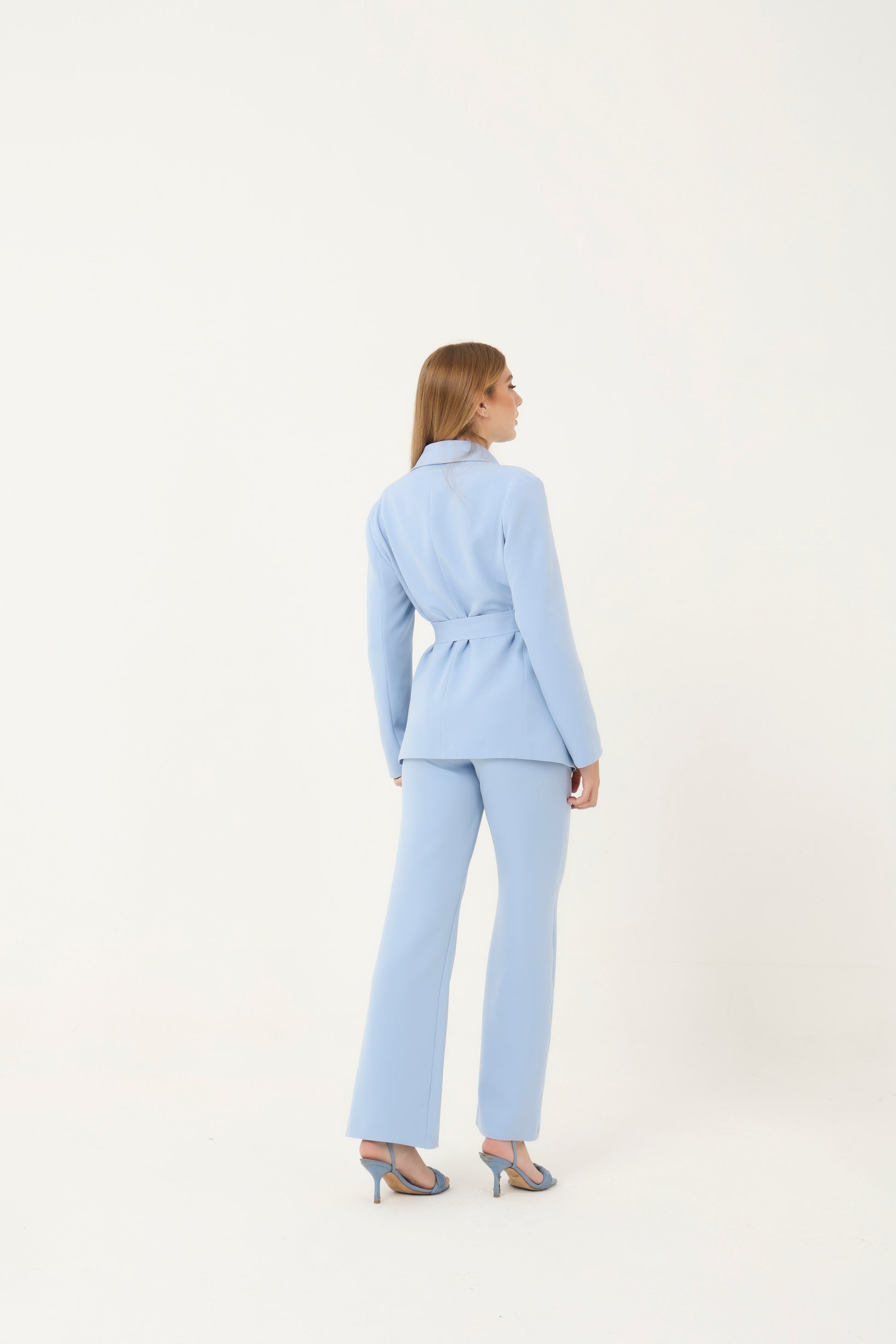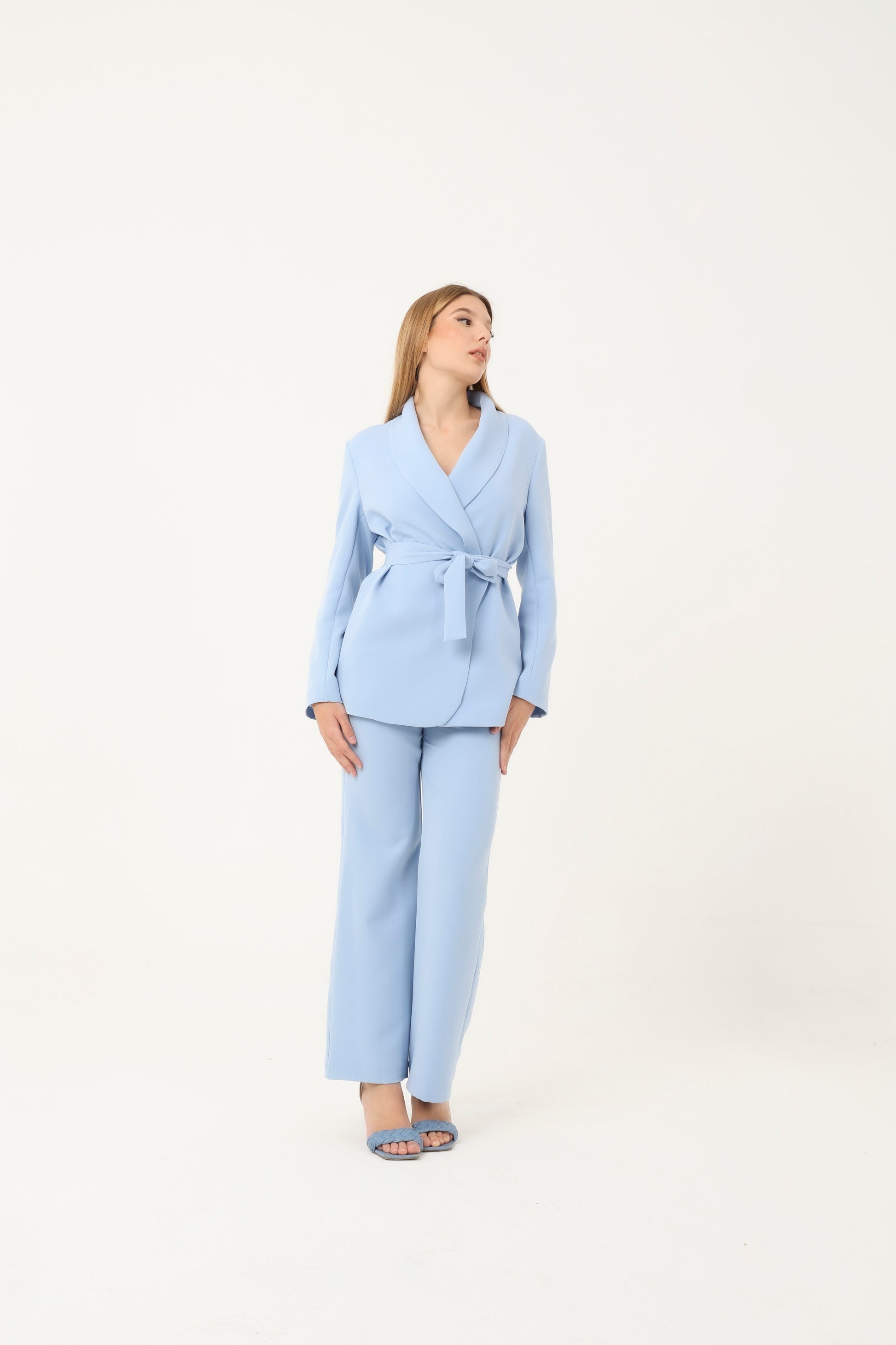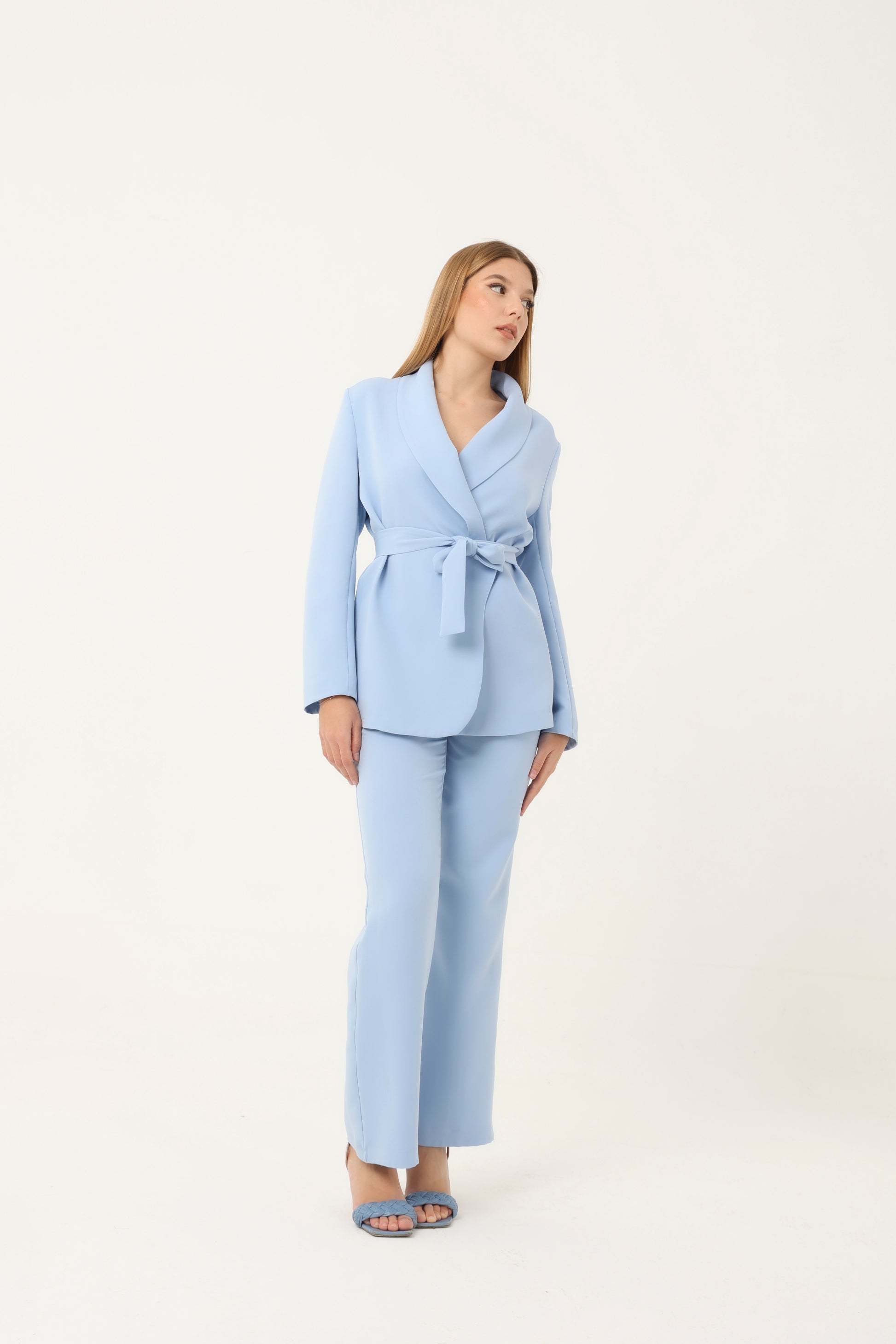 Tailleur elegante e moderno composto da giacca e pantalone coordinati. La giacca con collo sciallato, priva di bottoni, presenta una linea pulita e raffinata ed è completata da cintura in vita che valorizza la silhouette. I pantaloni a gamba dritta, con zip frontale, garantiscono una vestibilità comoda e sofisticata, perfetta sia per il lavoro che per occasioni più eleganti.